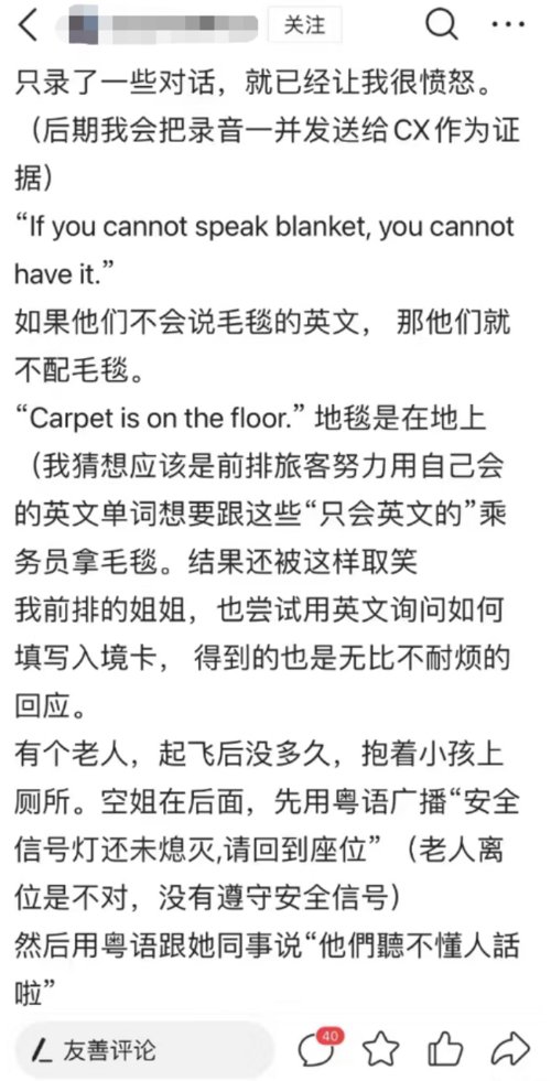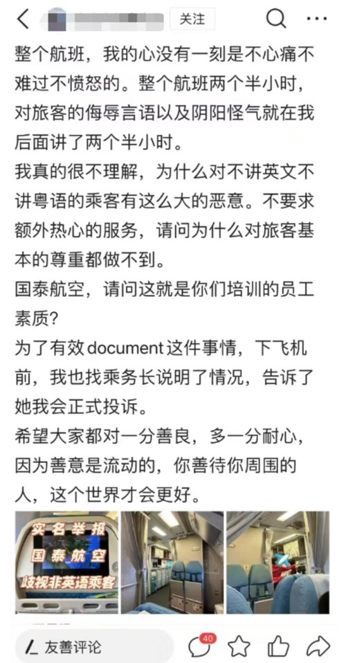 此前,有网友发帖举报国泰航空歧视非英语乘客,引起广泛关注。一位乘客在搭乘国泰航班CX987时,所在的座位位于飞机尾,乘务员在后方开始使用英文、粤语抱怨,甚至有歧视性的言语。