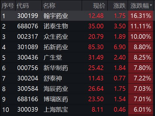 从个股上来看,众生药业一早拉出涨停板,翰宇药业涨超16%,诺泰生物涨11%,拓新药业、广生堂、新华药业、舒泰神、海辰药业等多股大涨。