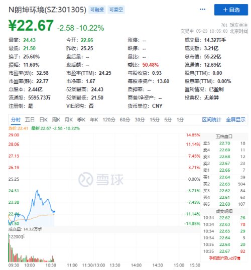 其中,朗坤环境发行价格25.25元/股,发行市盈率为26.45倍。上午开盘价为22.66元,跌幅10.26%,盘中跌幅一度接近15%。
