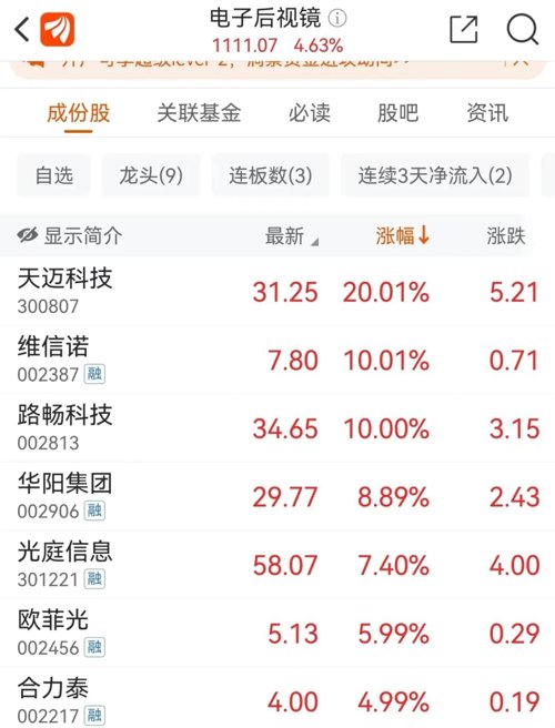 12日早盘,电子后视镜概念盘中异动拉升,天迈科技20CM涨停,维信诺、路畅科技涨停,华阳集团、光庭信息、欧菲光、合力泰跟涨。