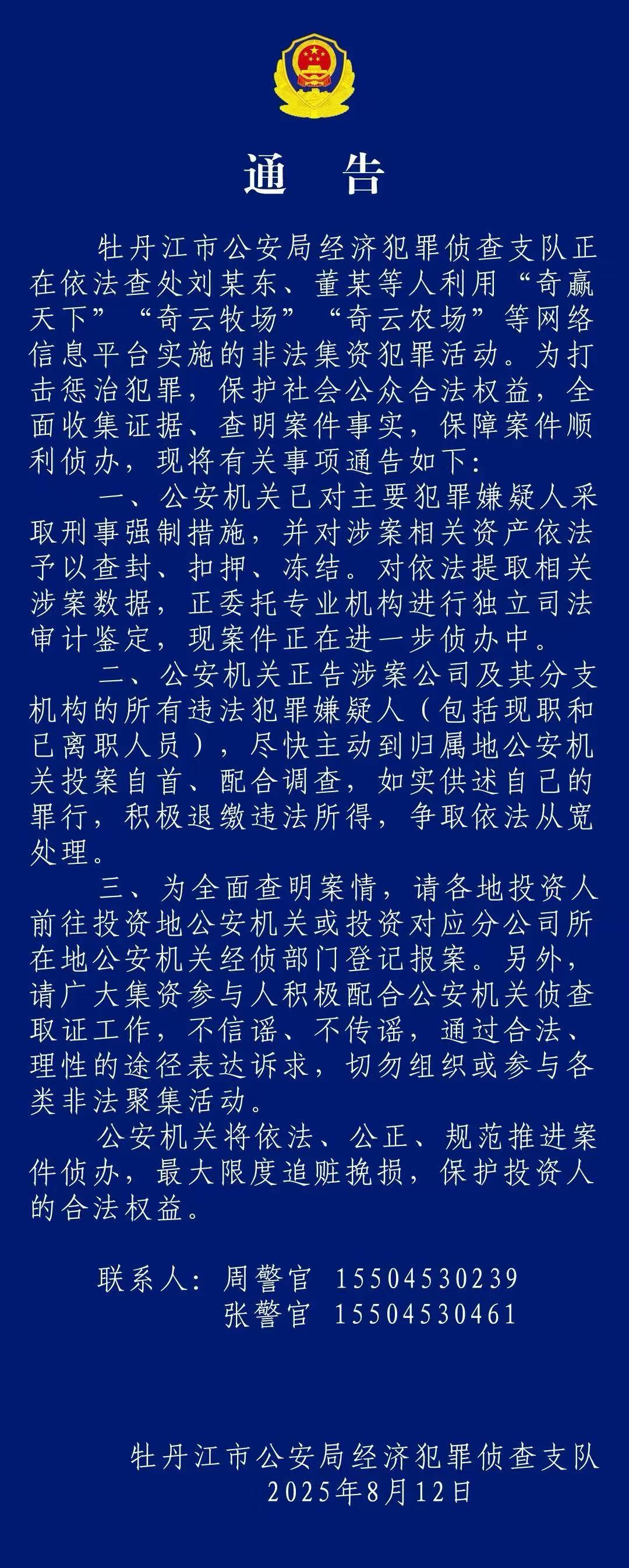 牡丹江公安关于“奇赢天下”、“奇云牧场”、“奇云农场”等网络平台非法集资犯罪活动的通告来了!
