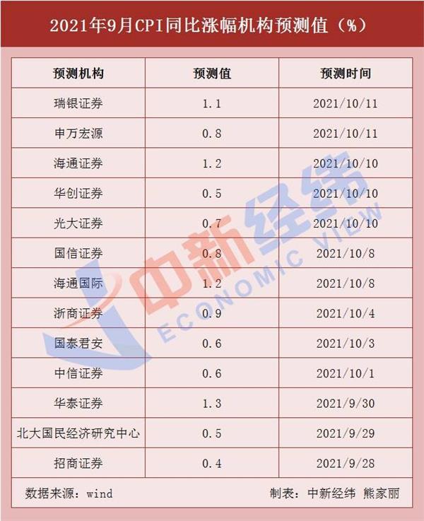 今日(14日)上午,国家统计局将公布2021年9月份居民消费价格指数(CPI)。多家机构预测均值显示,9月CPI同