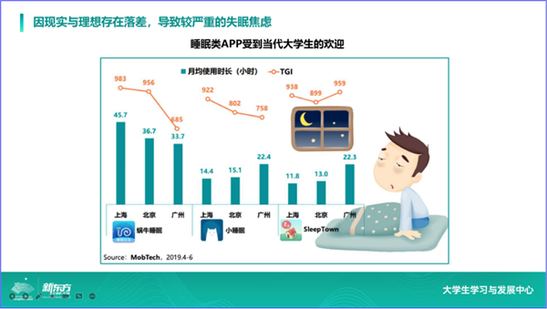 下边这个数据可以反映出大学生的焦虑现状。这是睡眠类APP受中国大学生欢迎的情况。使用的时长远远超出我们的想象。可以看到在北上广这样的大城市里面,月平均使用时长都在三四十个小时。如果大学生已经焦虑到无法倒头就睡,需要依靠睡眠APP才能进入梦乡的地步,我们有理由担心他们在心理和生理健康上都会受到挑战和冲击。