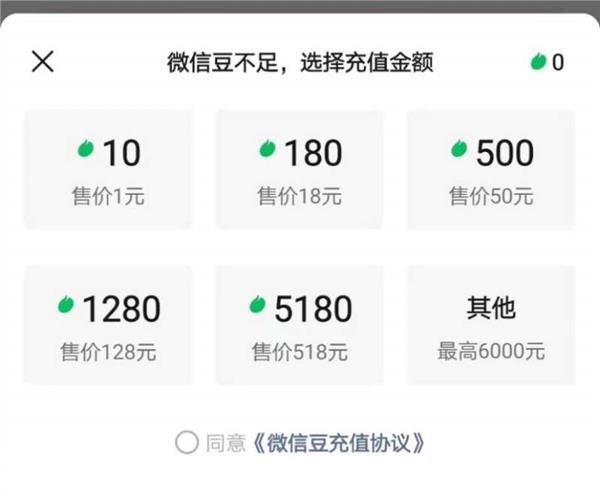 记者进一步查看支付页面发现,微信豆充值分为10微信豆1元、180微信豆18元、500微信豆50元等六种选择。照此计算,支付100元大概可以带来166-500人的观看量。