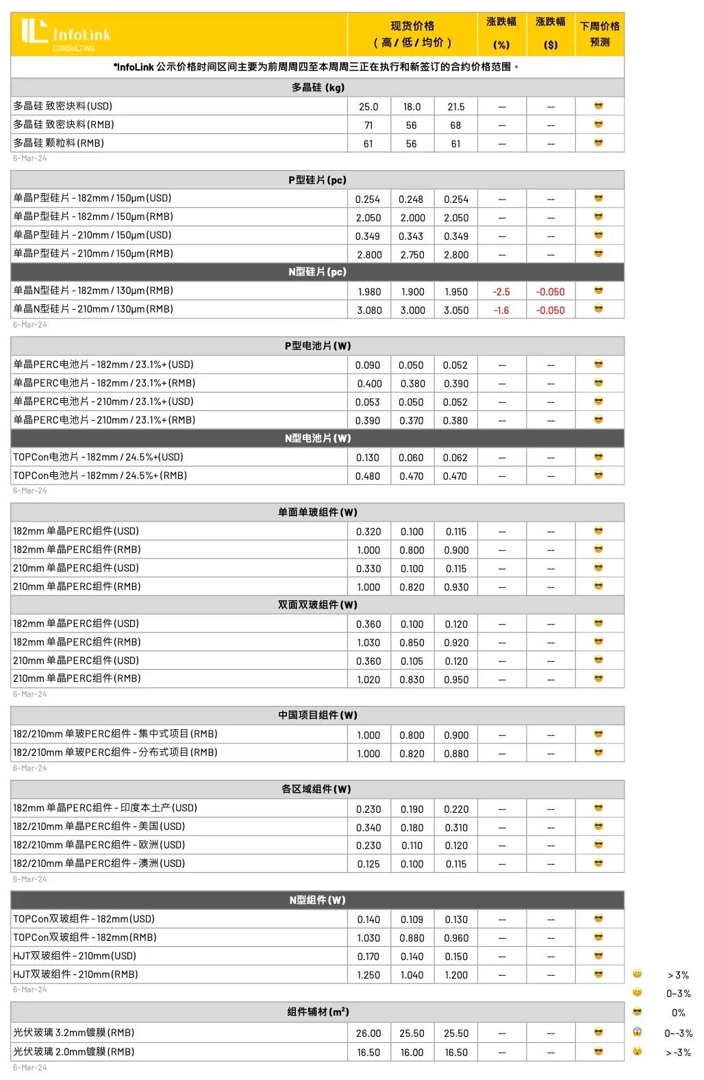 近期厂家仍旧酝酿涨势,厂家酝酿PERC产品涨价每瓦2-4分人民币,TOPCon产品也有1-2分人民币的幅度,然目前观察终端接受度确实仍不明朗,本周价格维持。目前对于三月整体预判价格维持上周看法以持稳为主,低价区段稍有上升。