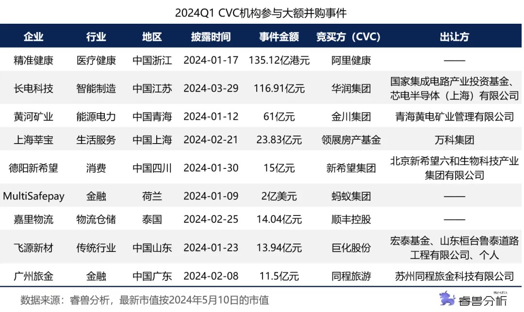 2024Q1,国内CVC参与的并购事件共48起,已披露交易总金额为442.6亿元,CVC参与的单笔金额超10亿人民币的并购案例共9起,分布于8个行业,其中金融行业有2起大额并购事件。值得关注的是,国家集成电路产业投资基金和芯电半导体以29.00元/股的价格分别将其所持长电科技1.74亿股股份(占长电科技总股本的9.74%)和2.28亿股股份(占长电科技总股本的12.79%)转让给磐石香港或其关联方,合计转让价款为116.91亿元,而华润集团持有磐石香港100%股权。(来 源:创 业 邦)