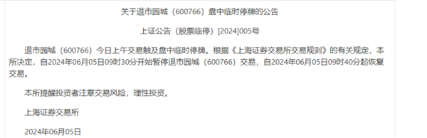 值得注意的是,由于股价跌幅巨大,截至发稿,上交所上午盘中对退市园城两次发布临时停牌公告。第一次临时停牌自9时30分开始,当日9时40分起恢复交易。