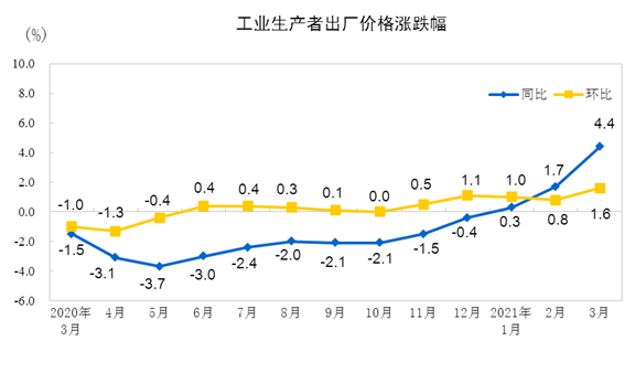 中国3月全国工业生产者出厂价格(PPI)同比上涨4.4%,涨幅为2018年7月来最大,超过预期的3.6%和前值1.7%;环比上涨1.6%。工业生产者购进价格同比上涨5.2%,环比上涨1.8%。1—3月平均,工业生产者出厂价格比去年同期上涨2.1%,工业生产者购进价格上涨2.8%。