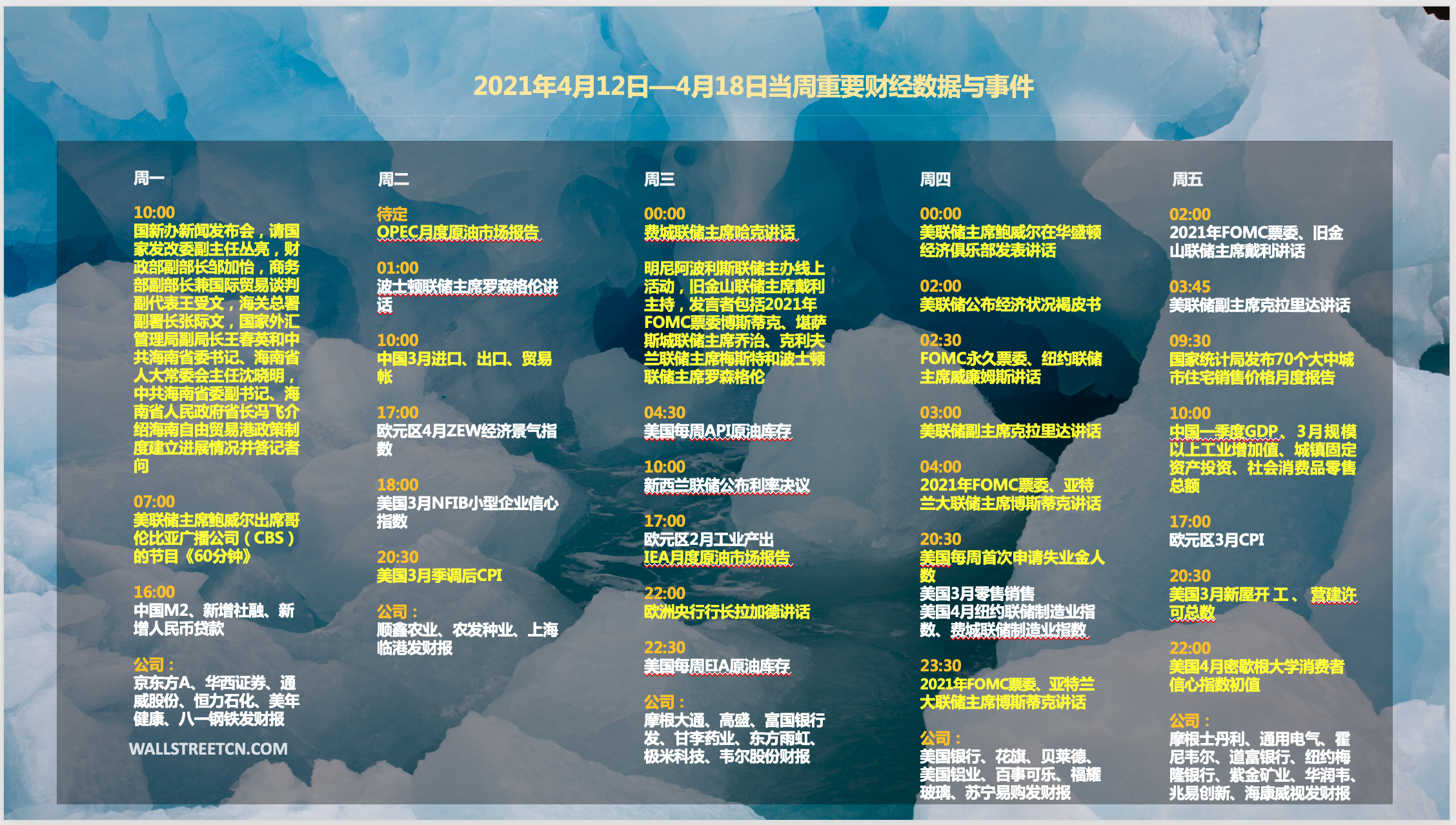 周三(4月14日),欧洲央行行长拉加德发表讲话,明尼阿波利斯联储主办题为“种族主义和经济:专注于经济学界”的线上活动,旧金山联储主席戴利主持,发言者包括2021年FOMC票委博斯蒂克、堪萨斯城联储主席乔治、克利夫兰联储主席梅斯特和波士顿联储主席罗森格伦;2021年FOMC票委、里奇蒙德联储主席巴尔金发表讲话;费城联储主席哈克在一场线上活动发表讲话;新西兰联储公布利率决议