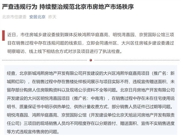而就在日前,北京市住房城乡建设委曝光了三个项目在销售过程中存在的违规问题,经查,有项目在销售过程中存在售楼处样板间展示与项目实际不符、违规宣传赠送面积、未留存部分购房人住房限购资料以及现场公示资料不全等问题。北京市住建部门并已向违规企业下达责令改正通知书,要求企业立即整改。